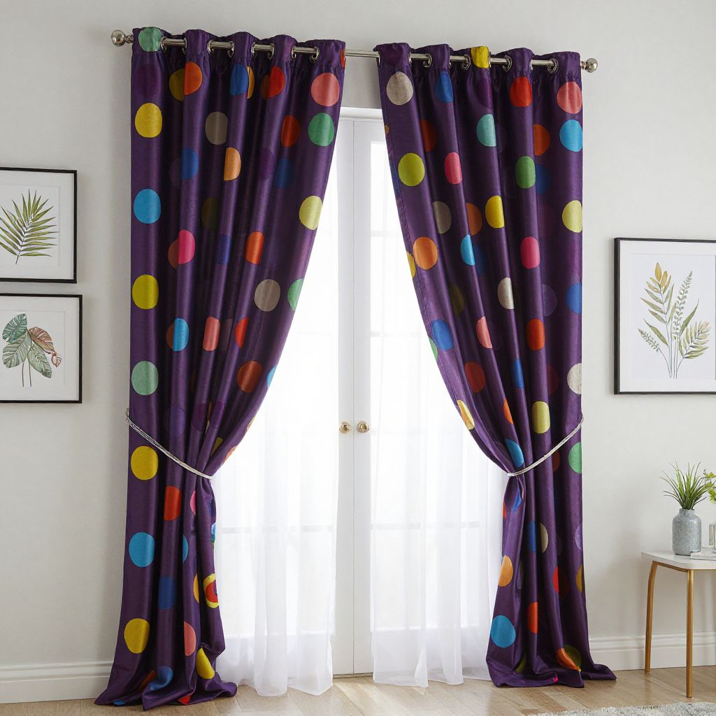 Vibrant 3D Colored Candy 703 Curtains elegantly drape a window, featuring bold patterns of multicolored circles against a deep purple backdrop, complemented by sheer white curtains and framed botanical artwork on the adjacent wall.