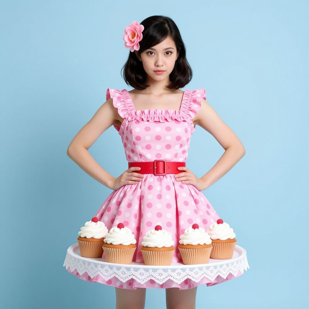 Photograph of an East Asian woman with fair skin and black shoulder-length hair, wearing a pink polka dot dress with ruffled sleeves and a red belt. A pink flower adorns her hair. She stands against a light blue background, hands on hips. At her waist level, a white lace-trimmed table holds six cupcakes with white frosting and red cherries. The dress's skirt flares out over the cupcakes, creating a playful, cupcake-themed look. The image has a bright, cheerful, and whimsical style.