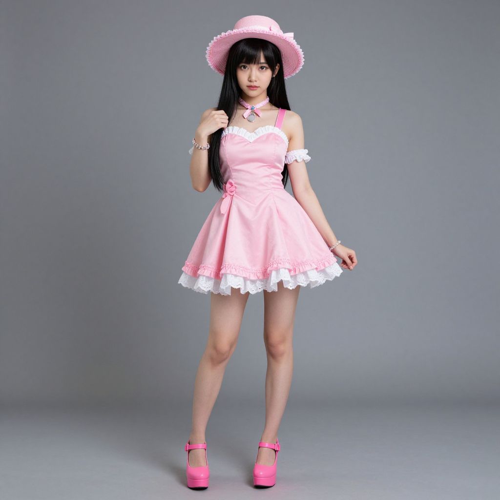 Asian woman in pink polka dot dress with red belt, black hair, flower hairpin, standing against blue background, hands on hips, cupcake