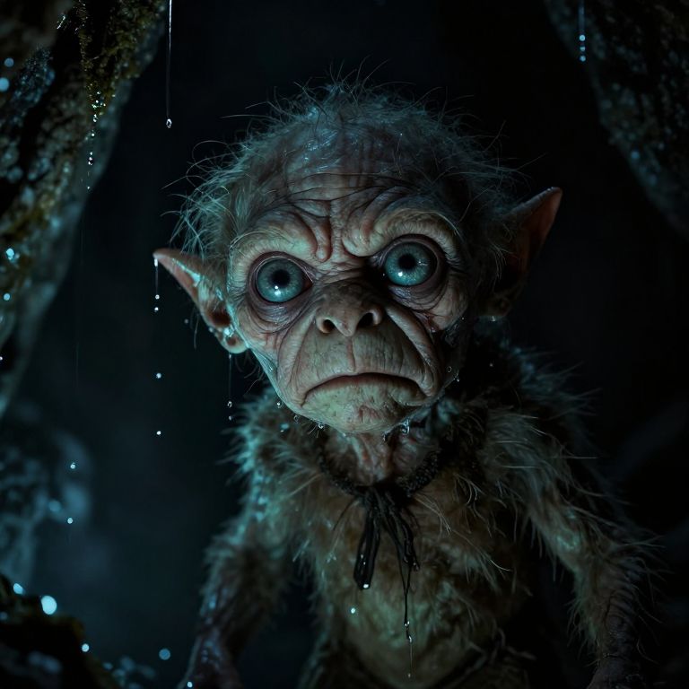 "Post-Apocalyptic a close up of Gollum, angry, dark, cave, water dripping, faint blues and greens, eye light sparkle, scary, empty, alone — cinema,"