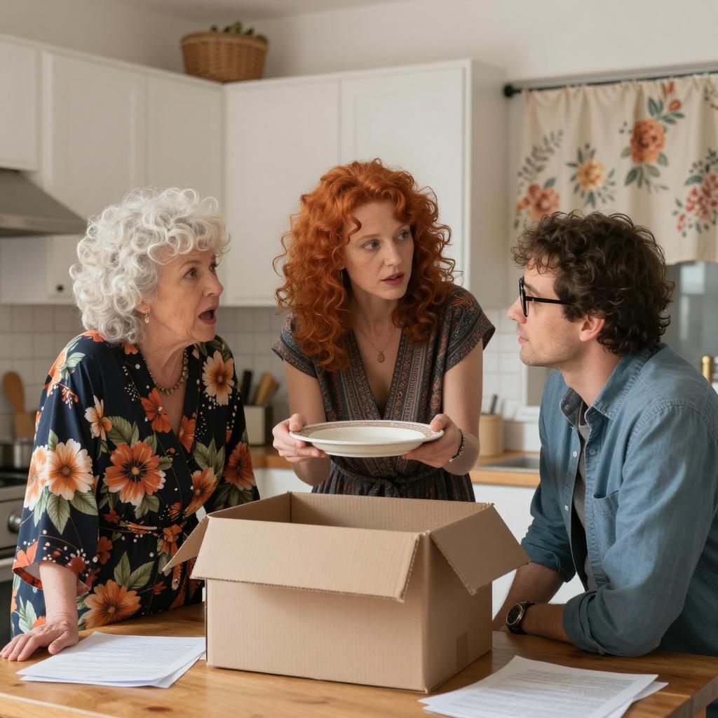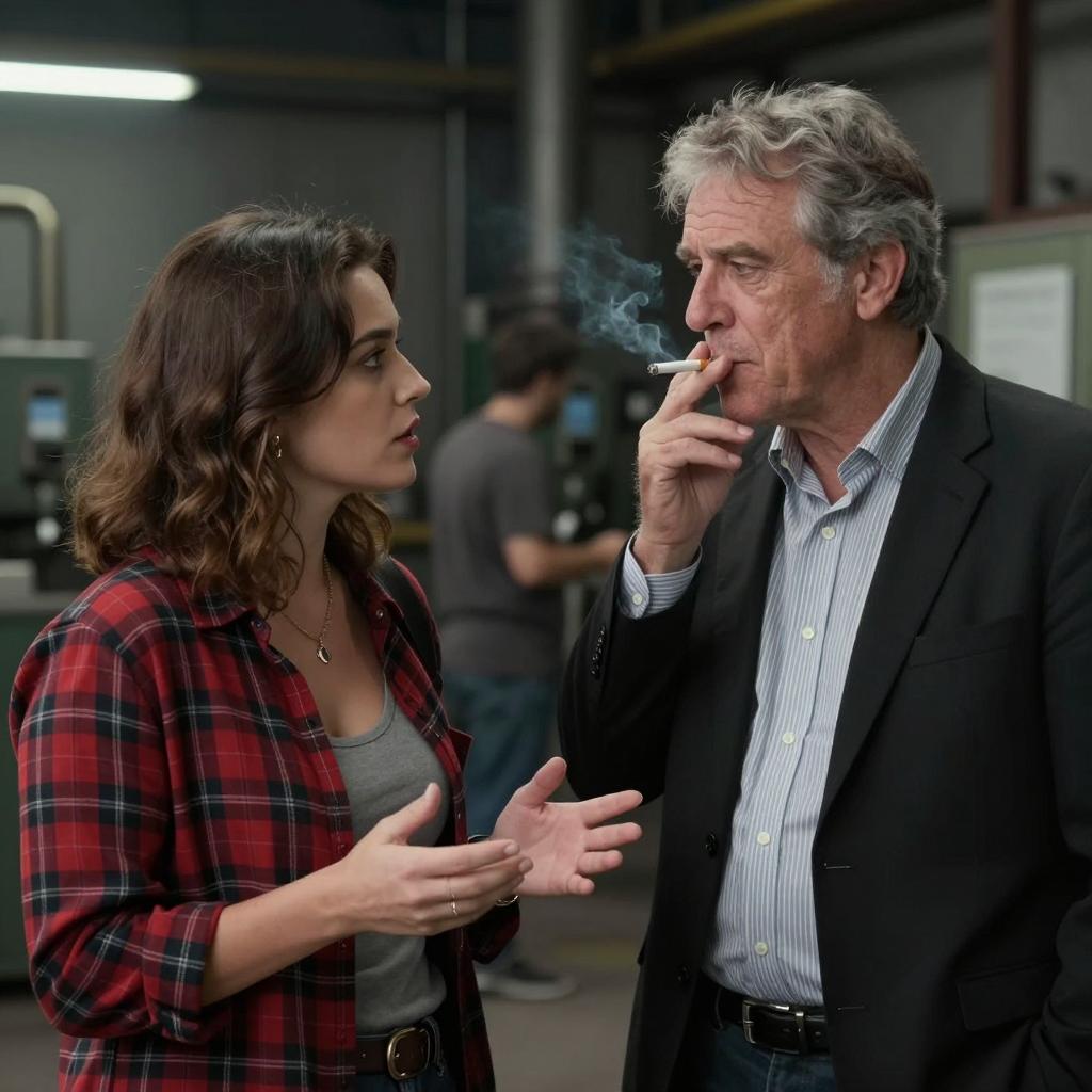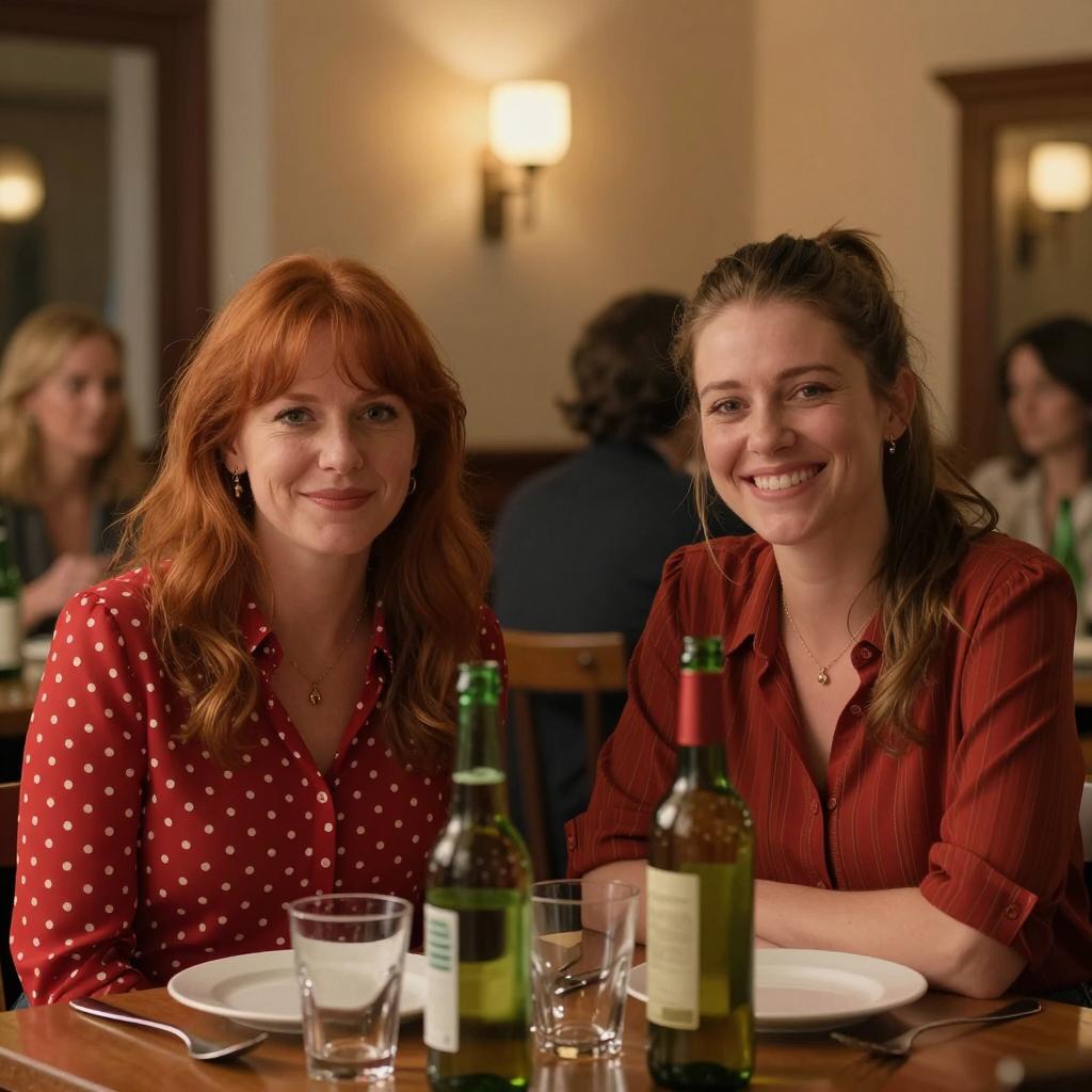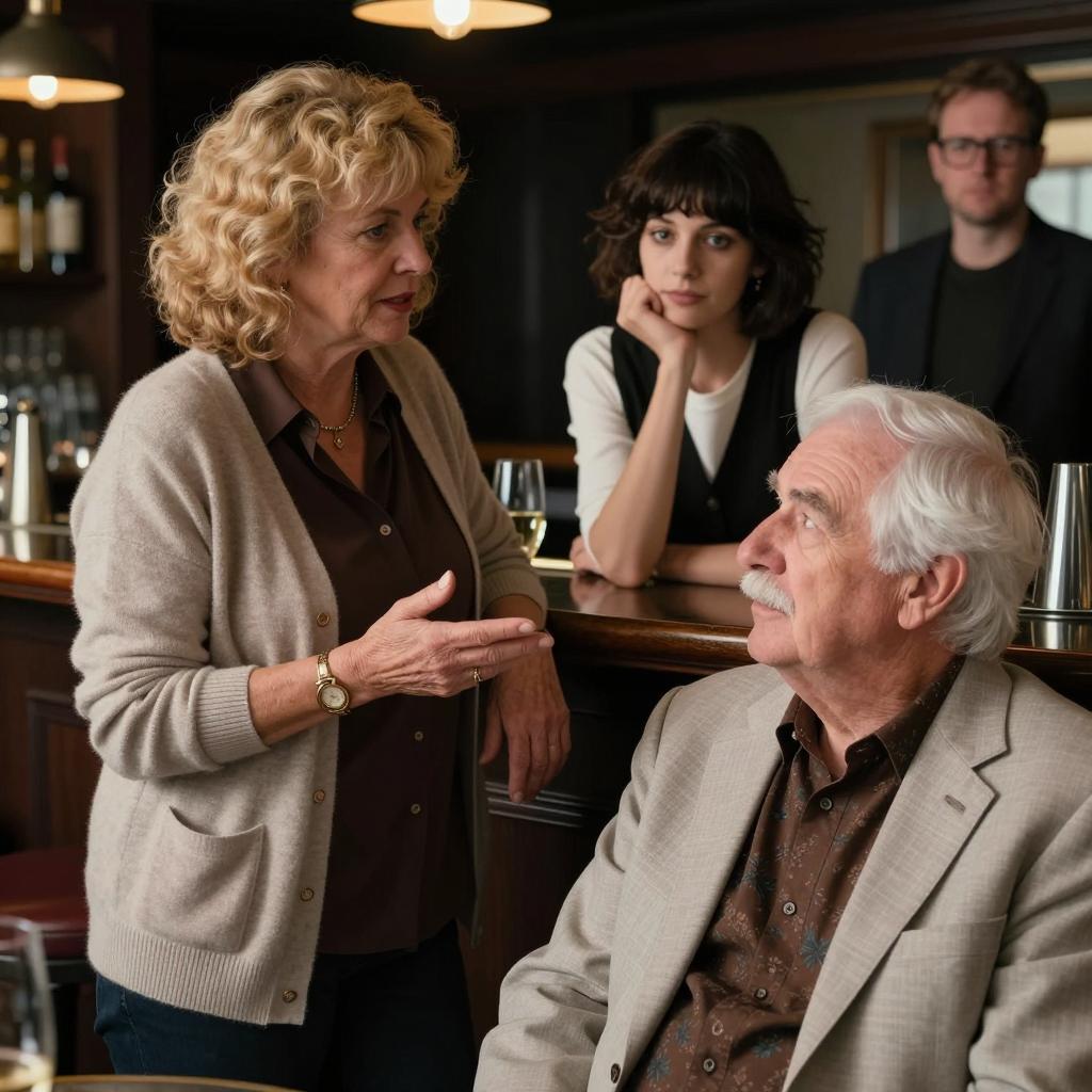 Three people in a dimly lit bar setting. A middle-aged woman with curly blonde hair wearing a brown blouse and beige cardigan is standing and gesturing with her hand. An older man with white hair and a mustache, dressed in a light gray blazer and brown patterned shirt, is seated and looking attentively at the woman. A younger woman with short dark hair, wearing a black top with white sleeves, rests her chin on her hand observing the interaction. The background features a bar counter with glassware and a man wearing a dark jacket and glasses.