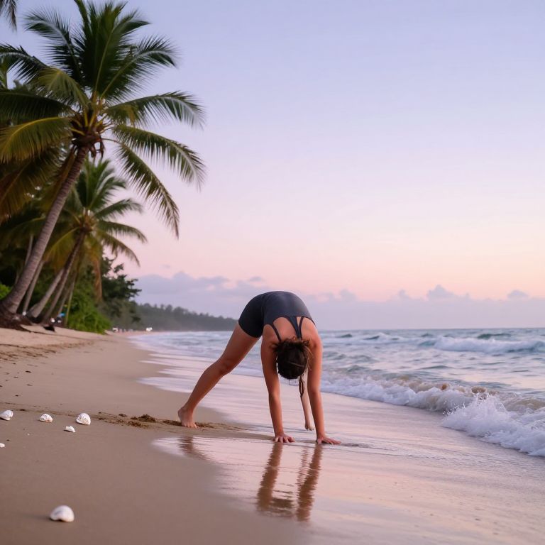 Yog on a tropical beach at dawn, gentle waves lapping at feet, soft pastel sky reflecting on wet sand, person gracefully stretching in a yoga pose surrounded by palm trees and sea shells, serene and invigorating, high resolution detail.