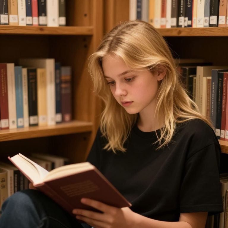 Photograph of a young blonde woman with fair skin and loose, wavy hair, sitting in a dimly lit library. She is wearing a simple black t-shirt and blue jeans, focused on a book she holds open in her hands. The background features wooden bookshelves filled with a variety of colored books, creating a cozy, scholarly atmosphere. The woman's expression is calm and introspective as she reads. The lighting is soft, highlighting her face and the book while the shelves remain slightly shadowed.