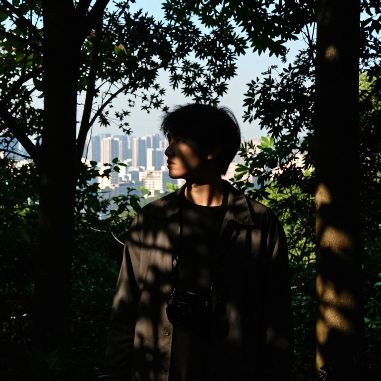Create a photorealistic portrait of a contemplative figure standing in a dense forest, as if captured with a mirrorless camera. The subject's silhouette blends seamlessly with the surrounding trees, their features obscured by dappled sunlight filtering through the canopy and casting intricate shadows on their face and attire. A subtle cityscape backdrop, a bustling metropolis, faintly emerges behind them, its artificial glow creating a subtle contrast with the organic serenity of the forest. This juxtaposition of nature and urbanization evokes introspection and a sense of wonder. The viewer is drawn into the figure's pensive gaze, inviting reflection on our connection to both the natural realm and the concrete jungle we inhabit.