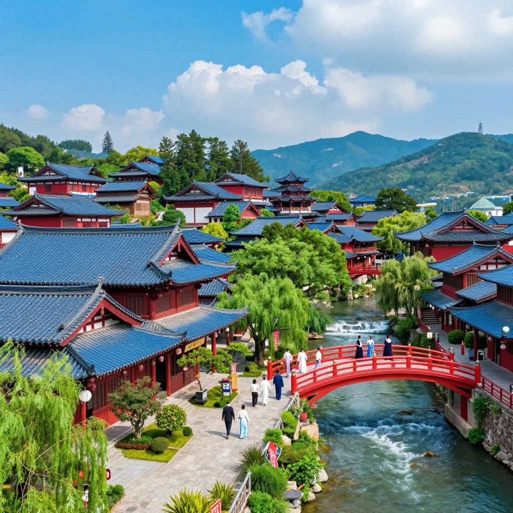 Scenic view of a traditional East Asian village featuring red buildings with blue tiled roofs alongside a river. People dressed in traditional clothing walk across a red bridge and pathways, surrounded by lush green trees and distant mountains under a bright blue sky with scattered clouds.