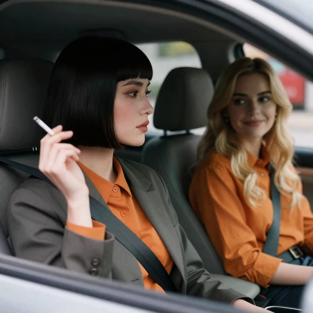 Photograph of two women in a car. Dark-haired woman with pale skin, straight bob haircut, holding cigarette, wearing gray jacket over orange shirt, sitting in driver's seat. Blonde woman with wavy hair, wearing orange shirt, seated in passenger seat. Dark-haired woman looks at blonde woman, slightly smiling. Car interior visible, with gray seats and a red object in background.