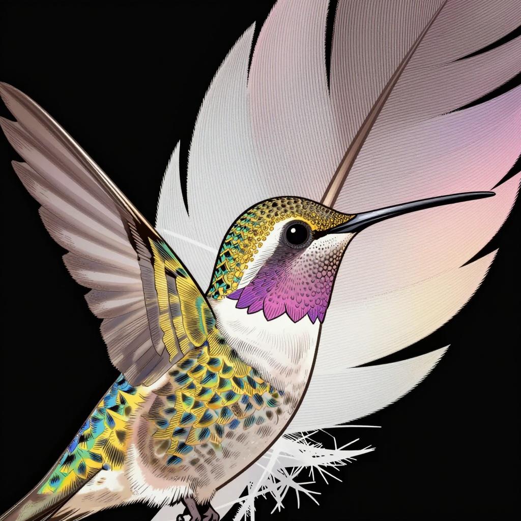 Extreme close-up macro shot of a intricate hummingbird feather in a minimalist Japanese sumi-e, rendered with soft morning light with subtle shadows, vector-sticker simplicity, pastel gradient backdrop, graffiti accents, golden-ratio composition, detailed comics inking, crisp line art, ultra-high-res 8K, intricate textures, black background, no watermark.