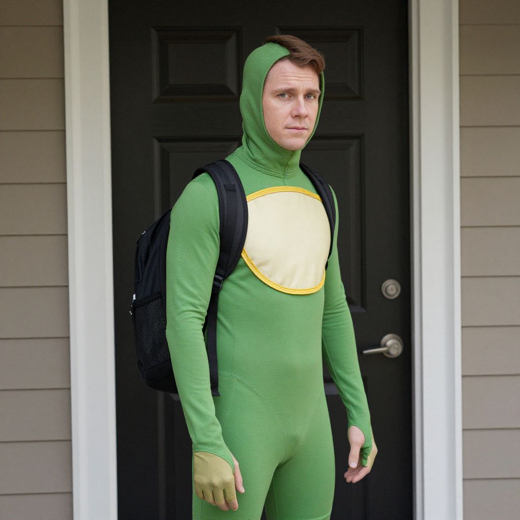 Photograph of a man in a green superhero costume with a yellow sun emblem, brown hair, black backpack, standing in front of a black door and