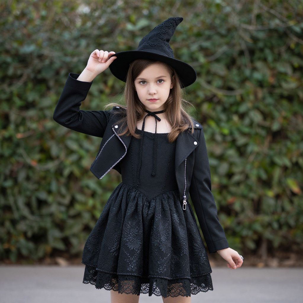 Photograph of a young girl with fair skin and brown hair, wearing a black witch hat, long-sleeved black dress, and jacket, standing