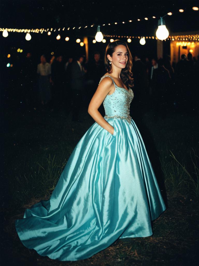 Photorealistic portrait of a woman wearing a luxurious teal blue party gown with a full skirt and sleeveless design. She stands outdoors at night with decorative string lights glowing softly in the background, creating an elegant and festive atmosphere.