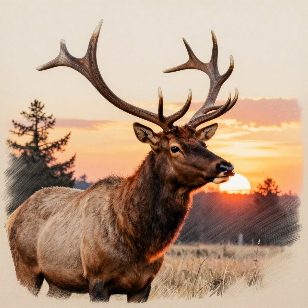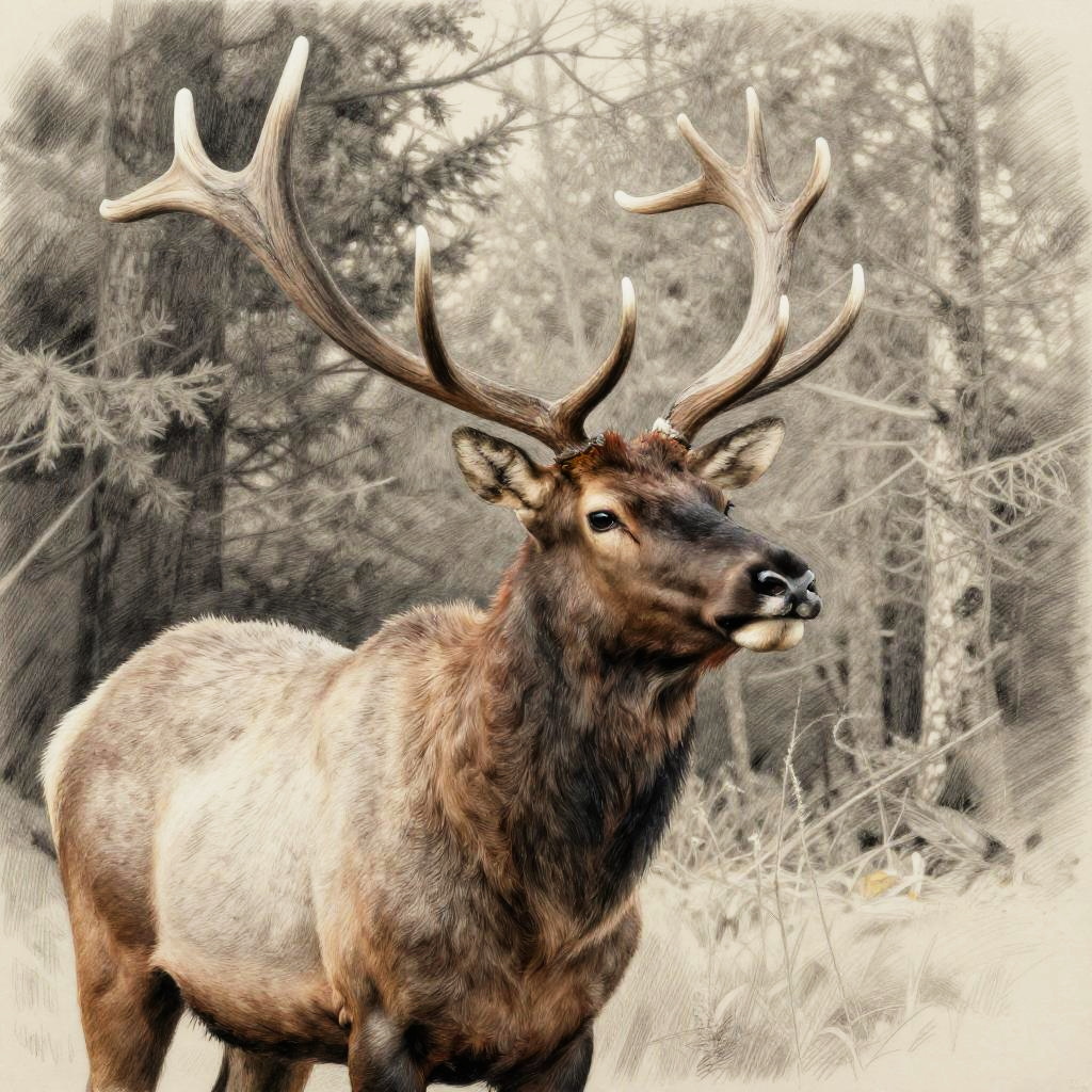 Digital drawing of a majestic elk with large antlers, walking through a forest clearing with pine trees and fallen autumn leaves.