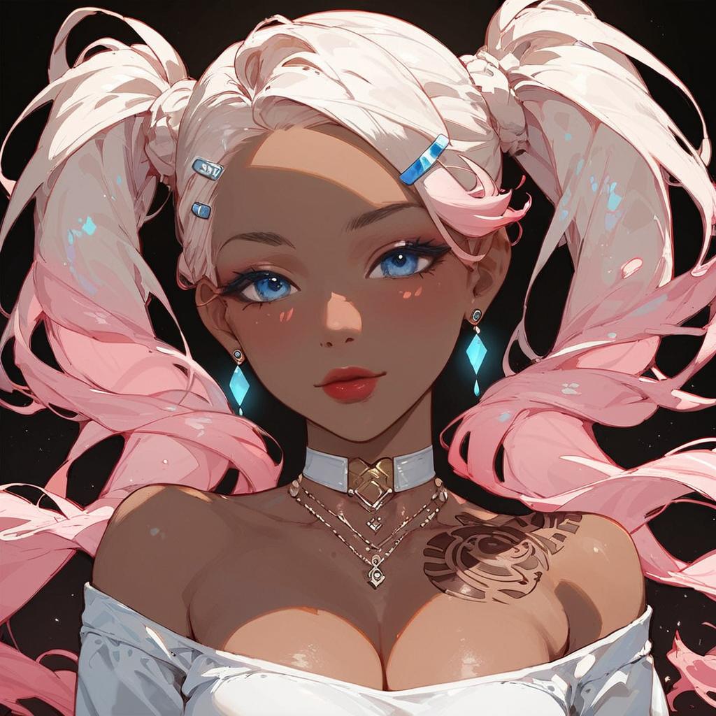 Score_9, score_8_up, score_7_up, score_6_up, ganguro, source_anime, 1girl, solo, long hair, black background, neon glow, blond hair, pink highlights, earrings, dark-skinned female, tattoo, colored skin, , face stickers, pursed pink lips, eyeshadow, very dark skin, (makeup), choker, off-the shoulder crop top, cleavage, hairclip, twintails, bangs, jewelry
