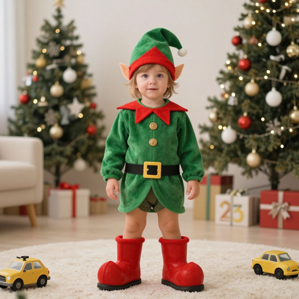 Child wearing a cartoon-style elf costume with big red boots and a green jacket, playing in a toy-filled playroom with a Christmas tree, soft focus and festive lighting, family portrait style