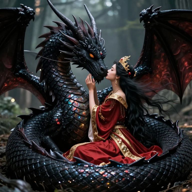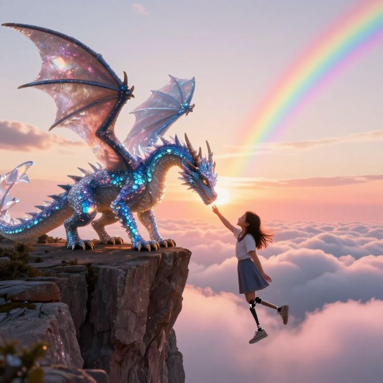 FLUORESCENT, GLOW, a majestic young dragon with wings made of shimmering crystal perches on the edge of a vast cliff overlooking a sea of clouds, Its wings and scales catch the light of the setting sun, casting vibrant rainbows across the sky, A young timid but excited teenage girl inevntor with a prosthetic leg reaches out to touch the dragon as it bows it's head, The scene is bathed in soft, golden light, with the clouds below swirling in soft, pastel hues of pink and orange, A soft vignette centers on the moment of reverence between the figure and the dragon, highlighting the mystical and awe-inspiring nature of the encounter, capturing the quiet magic of this otherworldly moment