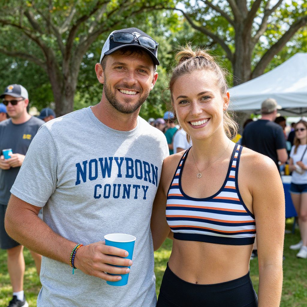 Two individuals enjoy a sunny outdoor event, with the man wearing a \"NOWYBORN COUNTY\" t-shirt and cap while holding a blue cup, and the woman in a striped sports bra smiling brightly, both surrounded by trees and other attendees in the background.