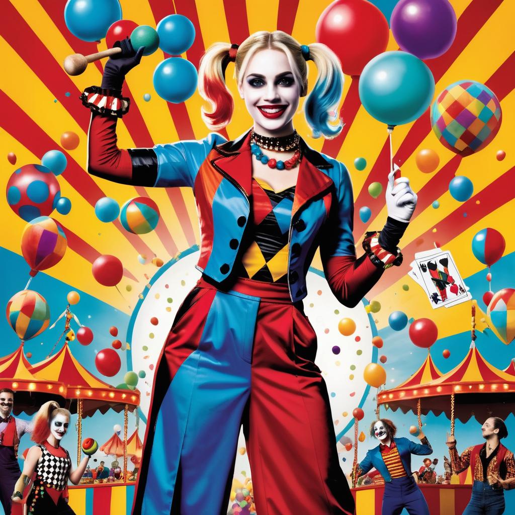 Harley Quinn as a circus performer, female, with a colorful costume and juggling props, set in a vibrant carnival.