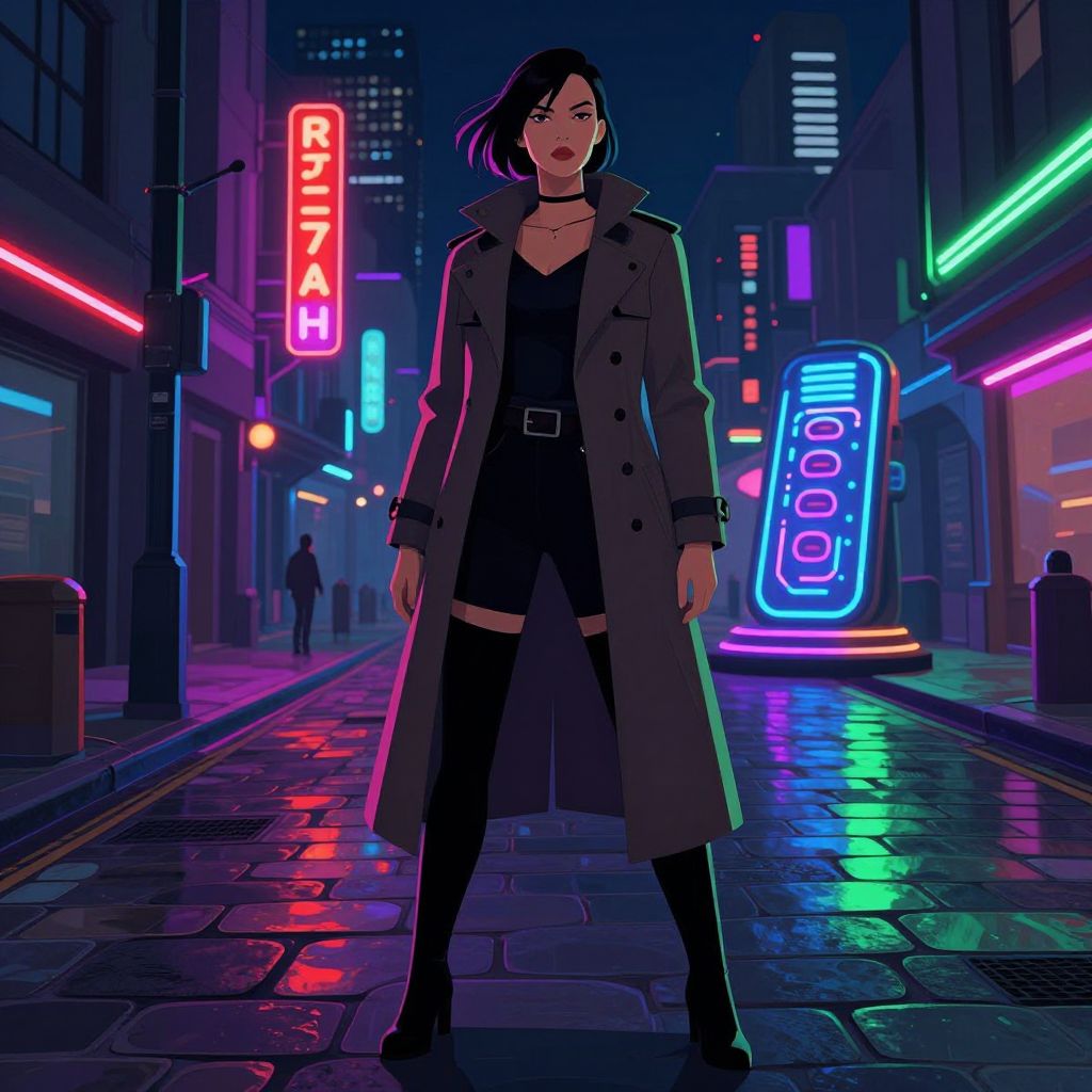 A woman stands in a red-lit doorway, surrounded by neon lights, in a 3D-rendered, 8k, 16:9 image.