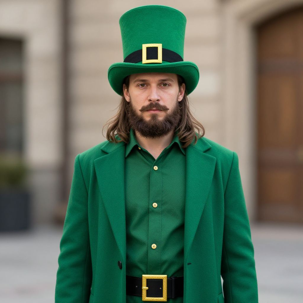 Photograph of a bearded man with a serious expression, wearing a green top hat adorned with a green shamrock, a green suit, and a gold vest with a matching gold bow tie. He holds a gold coin with a shamrock design in his right hand, raised to chest level. His left hand rests on his hip. The background is plain white, making the vibrant colors of his attire stand out. The image has a studio lighting effect, highlighting the textures and colors of his clothing and accessories.