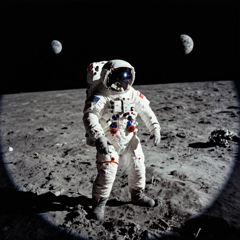 In this 360-degree RAW VR photo, Neil Armstrong is captured walking on the moon, his figure prominently positioned in the center. The astronaut's spacesuit, detailed with various patches and insignias, stands out against the lunar surface. The moon's rugged terrain, characterized by craters and rocky outcrops, stretches out in all directions. The image is framed by a circular vignette, with three smaller moons visible in the background, adding depth and perspective to the scene. The overall composition is balanced, with the astronaut's shadow cast on the moon's surface, emphasizing the scale and texture of the lunar landscape. The monochromatic color palette enhances the timeless quality of the moment, capturing the essence of this historic spacewalk.