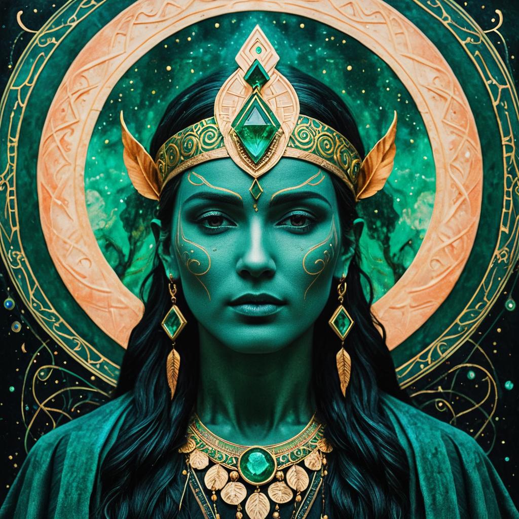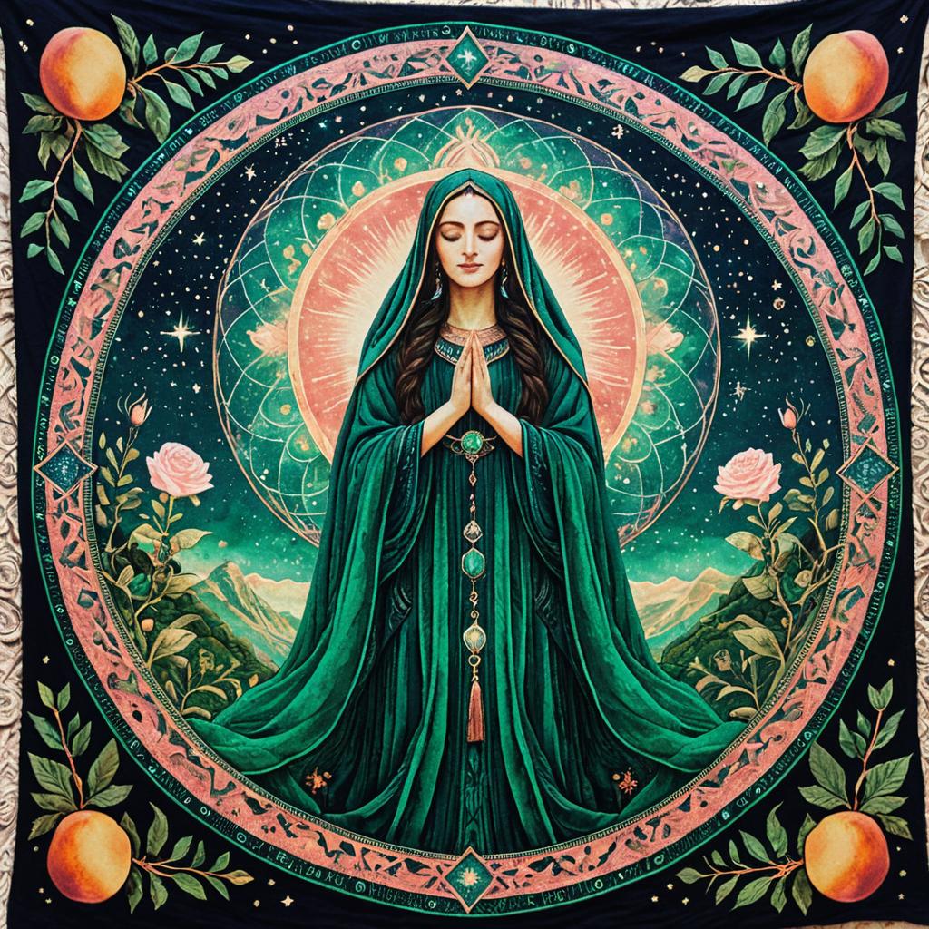 Crepe painterly Mystical dream veil storyteller as a ethereal protector, kaleidoscopic patterns, fantasy surrealism, mystical, ancient wisdom, agnostic spirituality, symbolism, beautiful lush colors, lots for sunset oranges and pinks and mint greens and silvers, dreamy,