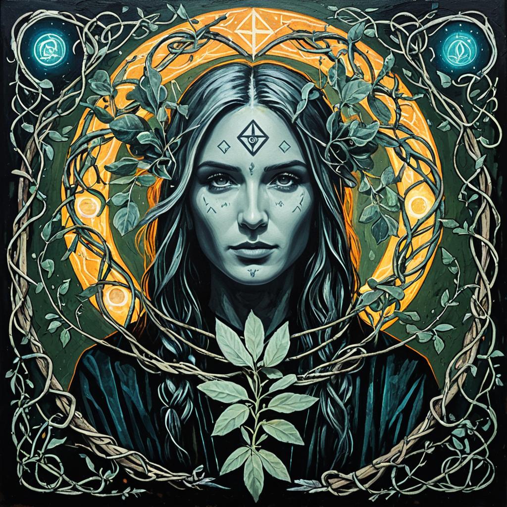 A mystical woman dressed in an intricate, embroidered veil and robe holding an orange fruit. She stands centered before a kaleidoscopic circular mandala backdrop with sunset hues of orange, pink, and mint green, surrounded by orange fruits and leafy branches. The image blends fantasy surrealism with symbolism and ancient wisdom themes, featuring lush, dreamy colors and delicate, ornate details.