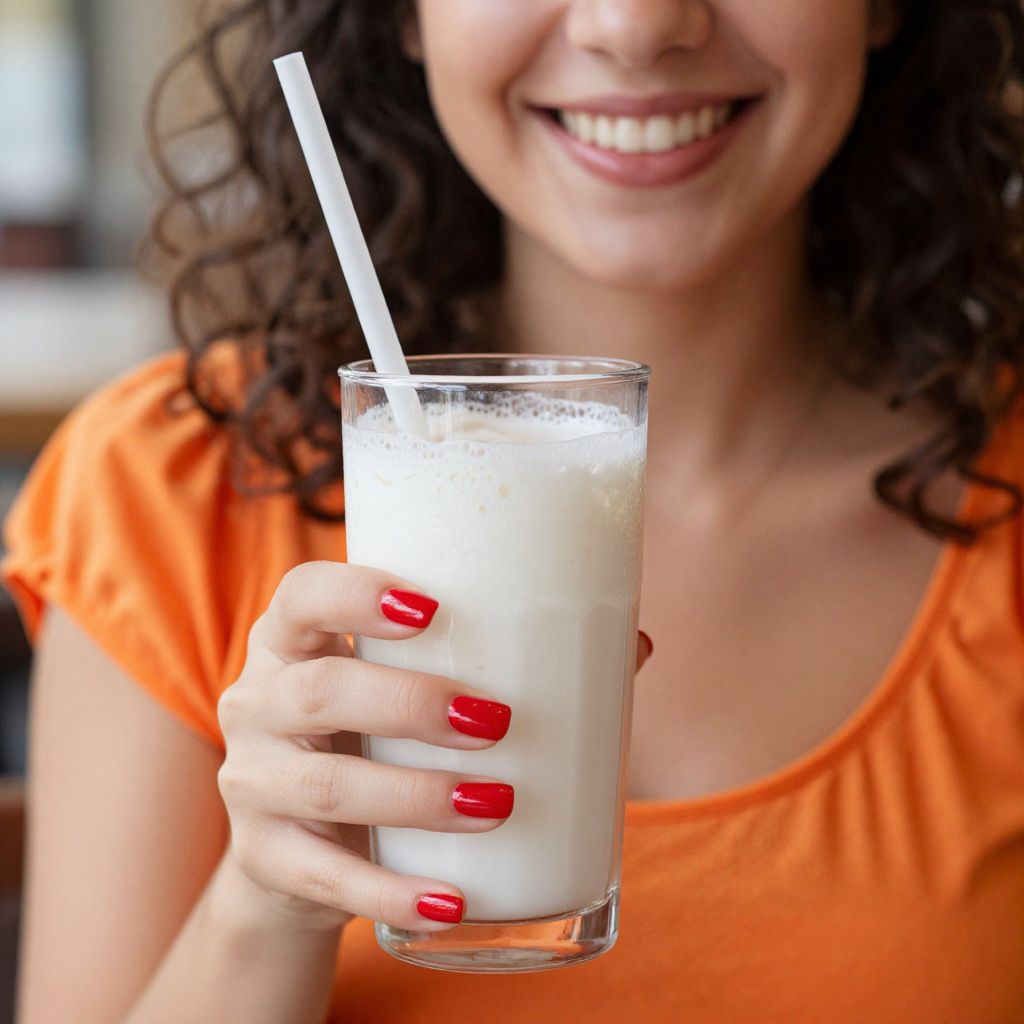 Smiling woman holding a tall glass of frothy coconut water with a white straw, showcasing vibrant red nail polish against her orange top.