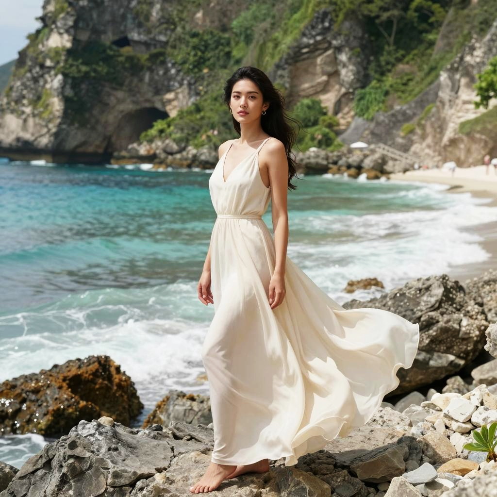 A beautiful Asian woman stands barefoot on rocky terrain by the ocean, wearing a flowing cream-colored sleeveless dress. The scene features vibrant turquoise waters and lush green cliffs in the background, creating a harmonious blend of natural beauty and elegant fashion.