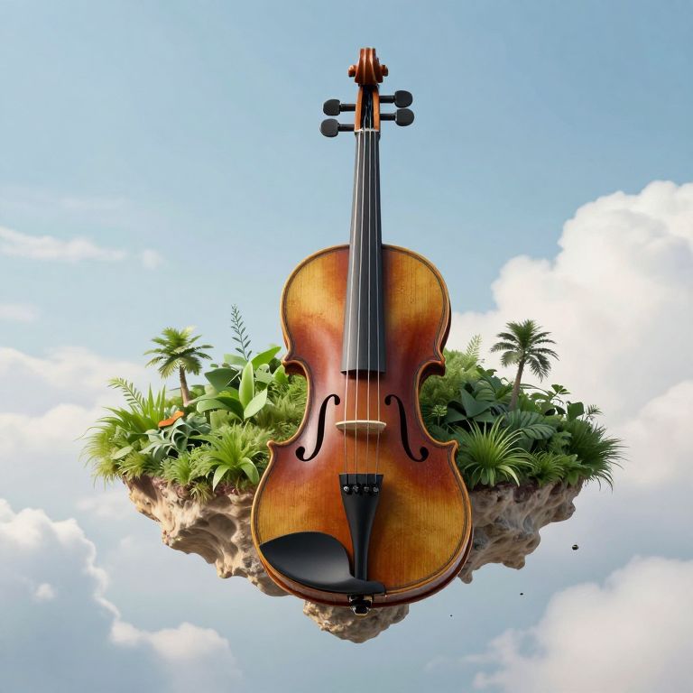 Suspended between heaven and earth, a violin-shaped island floats serenely, its lush greenery and taut strings resonating with an ethereal melody that whispers freedom, hope, and the timeless harmony of existence.