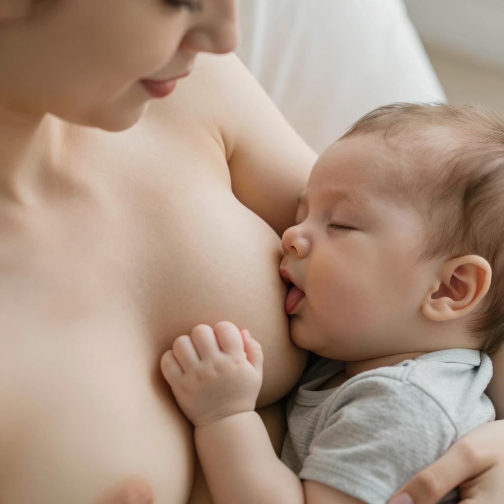 Close-up photograph of a breastfeeding mother and sleeping baby. Mother's light skin, pink lips, and large breasts. Baby's light skin, small hands, closed eyes, wearing a gray shirt. Mother's tongue touches baby's cheek. Baby's head rests on mother's chest. Soft lighting.