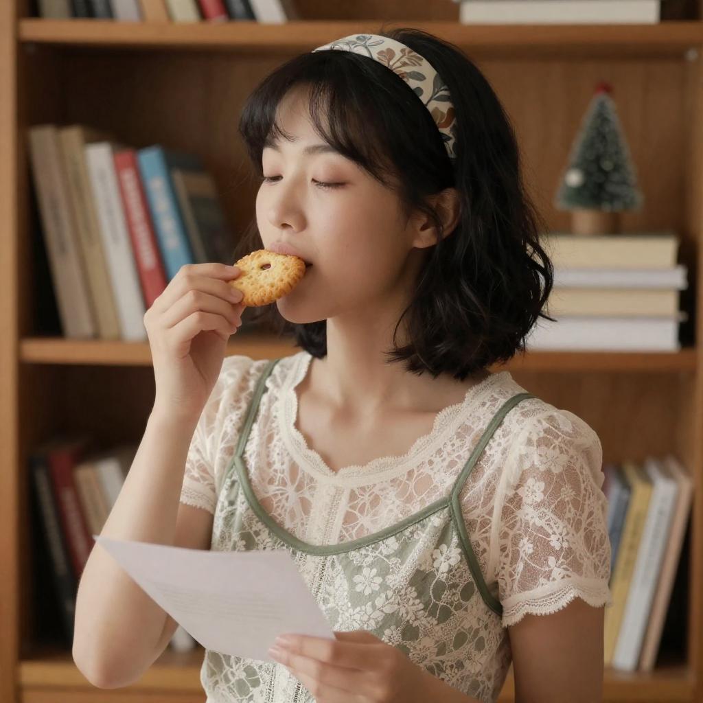 Young Asian woman with short wavy black hair wearing a floral lace white top and green tank overlay paired with a floral headband. She is holding a paper in one hand and eating a round cookie with the other, standing in front of a wooden bookshelf filled with books and a small Christmas tree figurine in the background. Her eyes are slightly closed as she enjoys the snack.