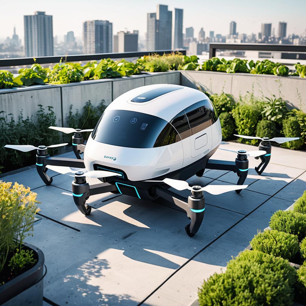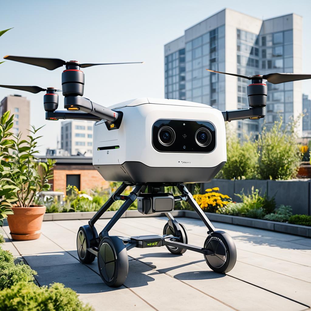 Close-up of a futuristic white delivery drone with a camera lens and four legs equipped with wheels, positioned on a modern city rooftop garden with green plants and urban skyscrapers in the background, captured in bright natural daylight.