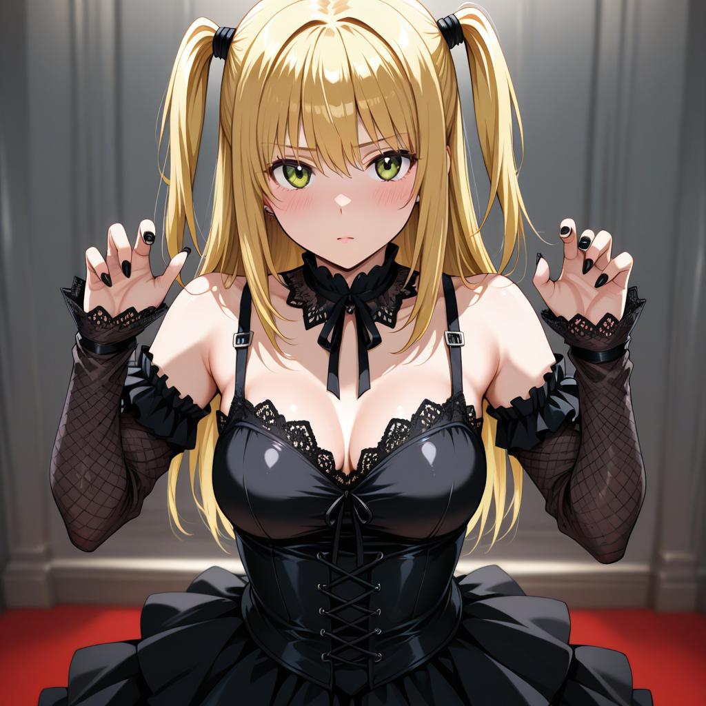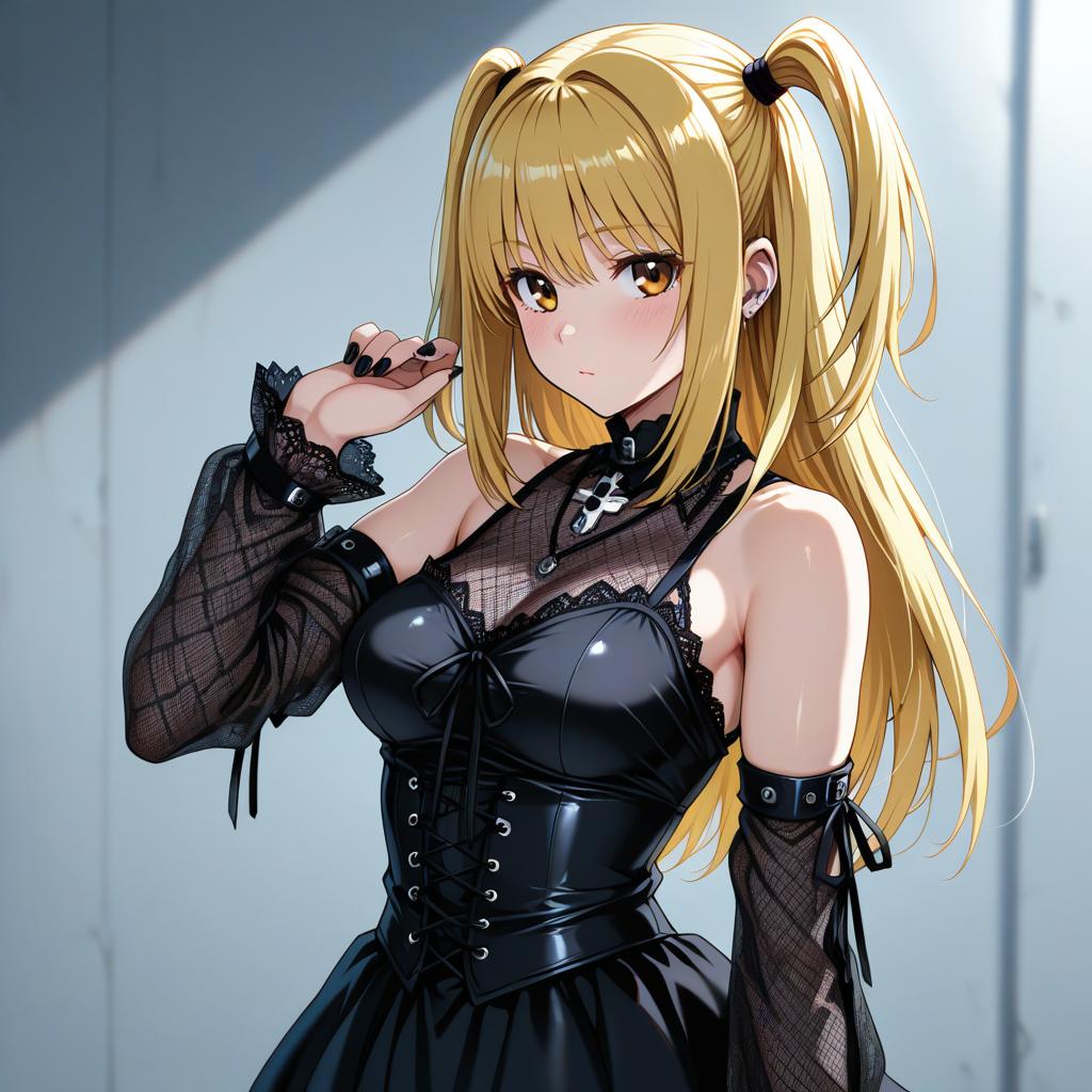 Amane misa, death note, 1girl, red eyes, blonde hair, long hair, two side up, medium breasts, black dress, bare shoulders, detached sleeves, nail polish, goth fashion, goth fashion, by artist oshiruko (uminekotei), illustrious