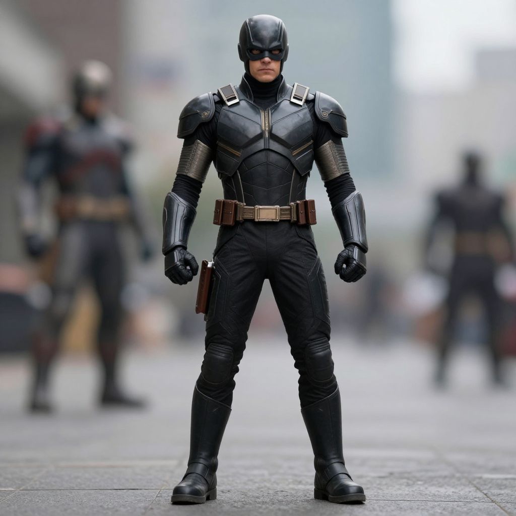 Ultimate alliance captain, male focus, armor, 1boy, boots, blurry background, standing, blurry, realistic, solo focus, full body, black pants