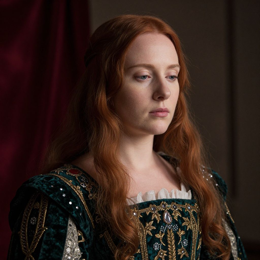 Photograph of a fair-skinned woman with long, wavy auburn hair, wearing a dark, intricately embroidered dress with gold patterns. Her expression is pensive, eyes slightly downcast, lips gently closed. She has delicate features and light freckles. The background is dark and blurred, highlighting her face and dress. The lighting casts soft shadows, adding depth to her contemplative look. The dress has a white, ruffled neckline, adding a touch of contrast to the dark fabric. The overall style is reminiscent of Renaissance or medieval fashion.