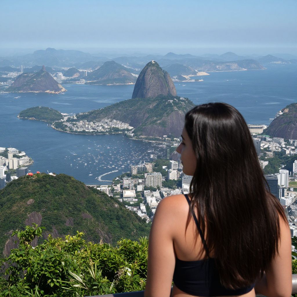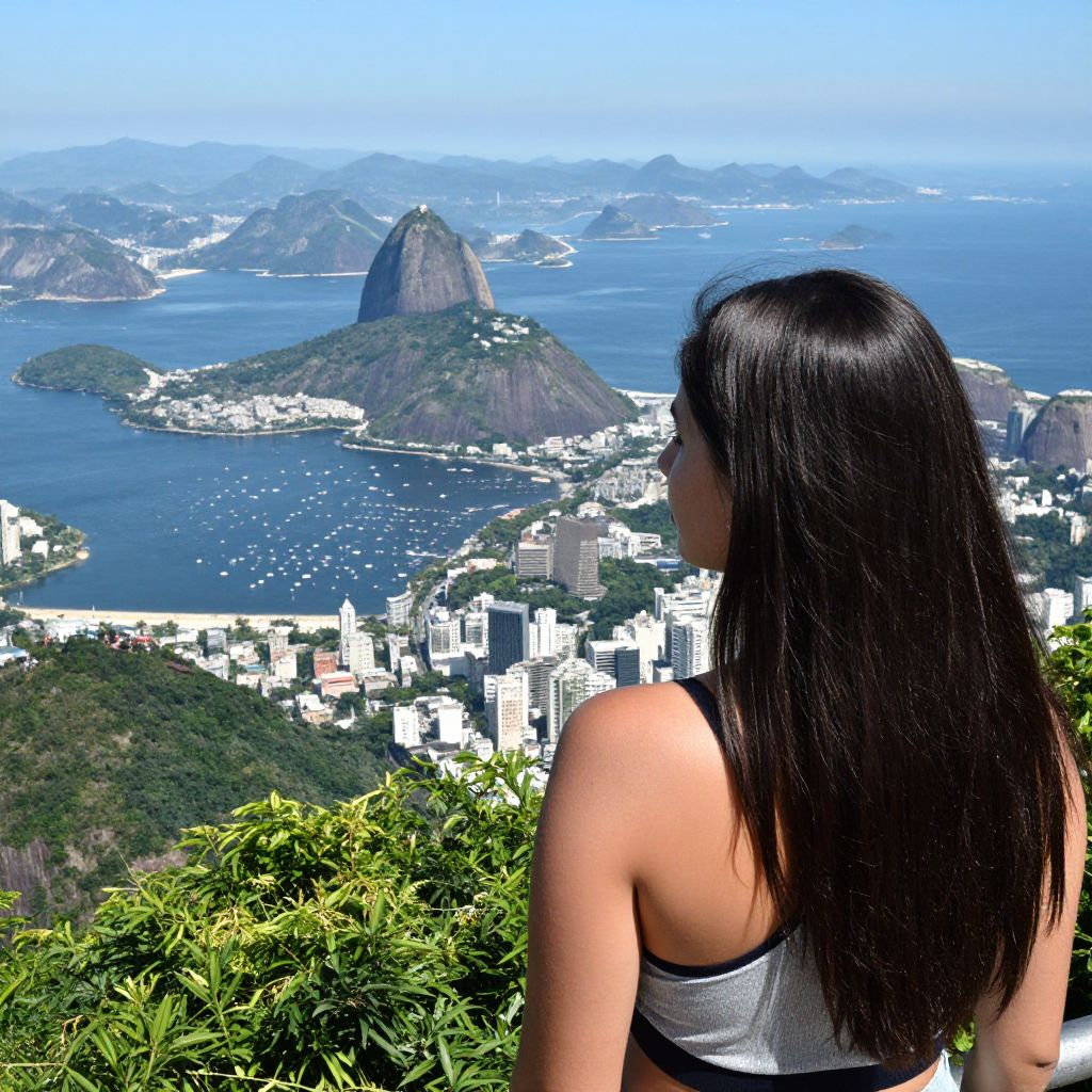 Back turned, a woman with long dark hair gazes toward the iconic Pedra da Gavea and São Conrado, framed by lush greenery and the azure sea, from the vantage point of Dois Irmãos Mountain in Rio de Janeiro, Brazil, South America.