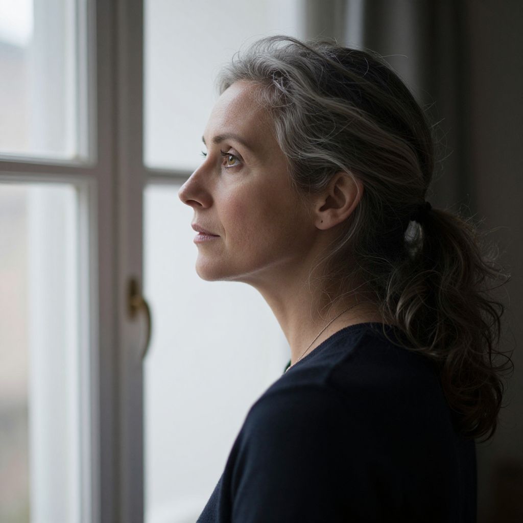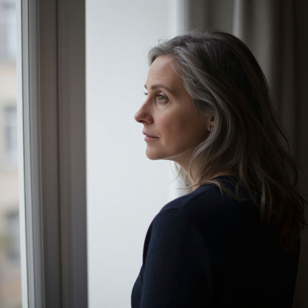Photograph of a middle-aged woman with gray hair, wearing a black top, gazing thoughtfully out a window, bathed in soft natural light