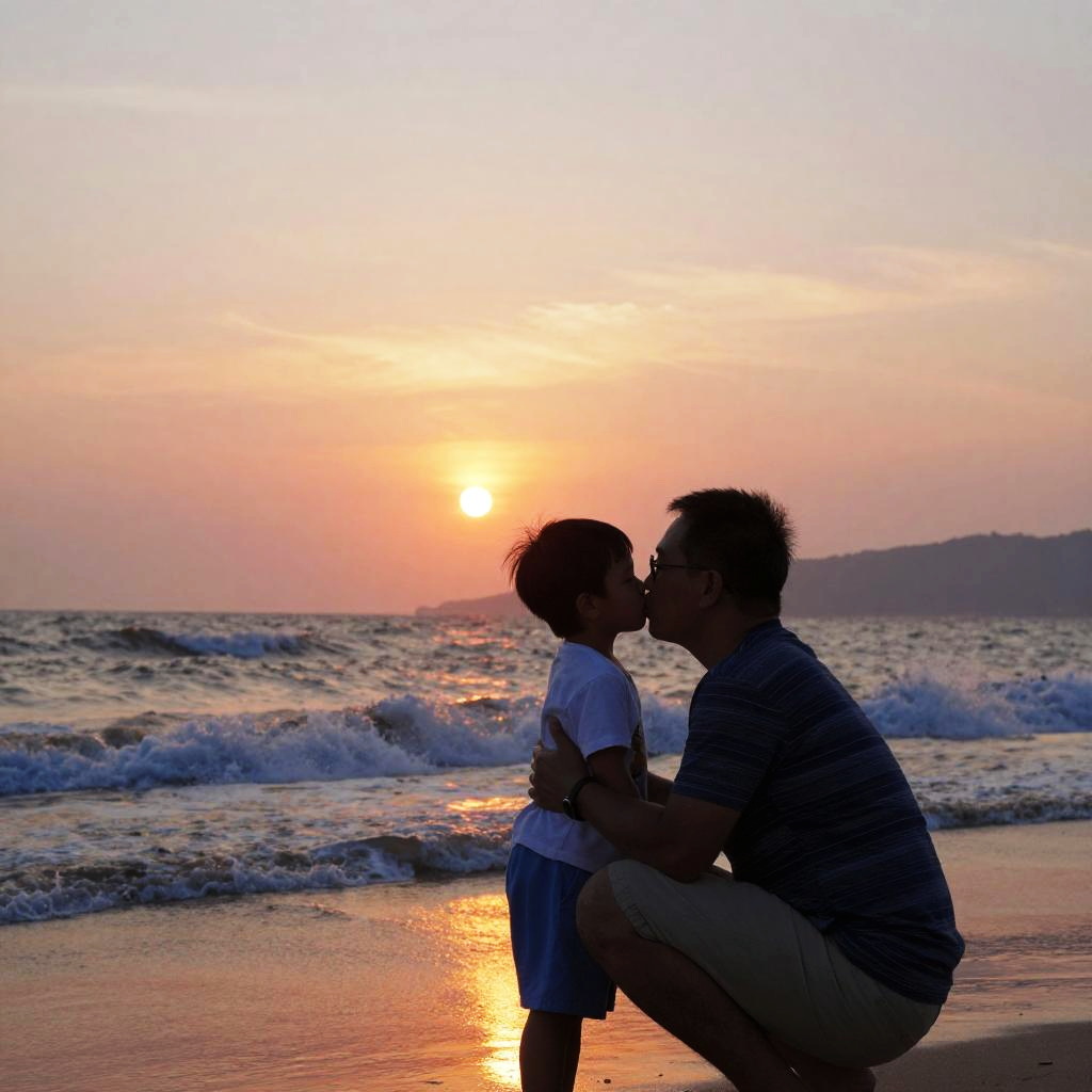 Father and son kissing under a golden sunset on a beach, waves crashing nearby, serene atmosphere, vibrant hues of orange and pink, detailed natural elements, heartfelt connection
