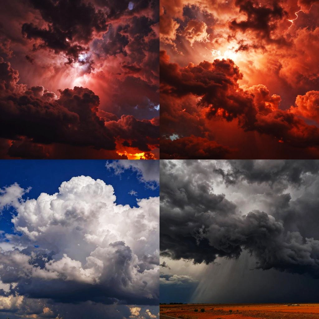 This image is a digital collage of four vivid, dramatic sky shots. Each quadrant showcases a different stormy sky with intense colors: fiery reds, bright blues, and glowing whites. The clouds are thick and turbulent, with bright light breaking through in some areas. The bottom right quadrant features a dark, stormy sky over a barren, orange landscape. The overall mood is intense and dynamic.