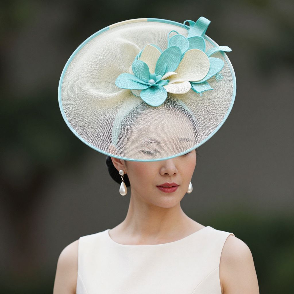Photograph of an Asian woman with fair skin, wearing a white dress and a large, translucent, teal flower-adorned fascinator, against a
