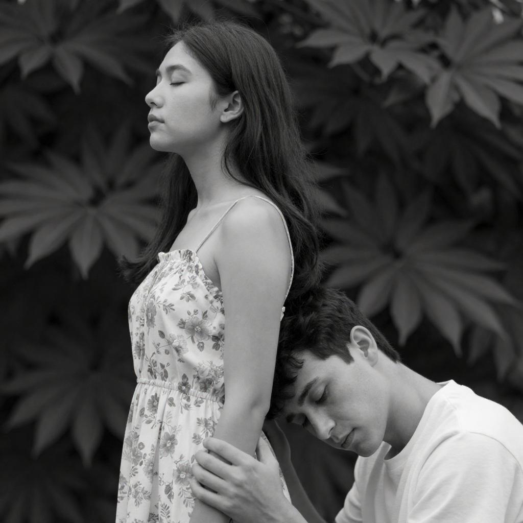 Black-and-white photograph of a young woman with long dark hair and a floral dress, standing with her eyes closed, as a man with short dark hair rests his head against her waist. The background is a ured, leafy tree. The man's eyes are closed, and his hand gently holds her waist.