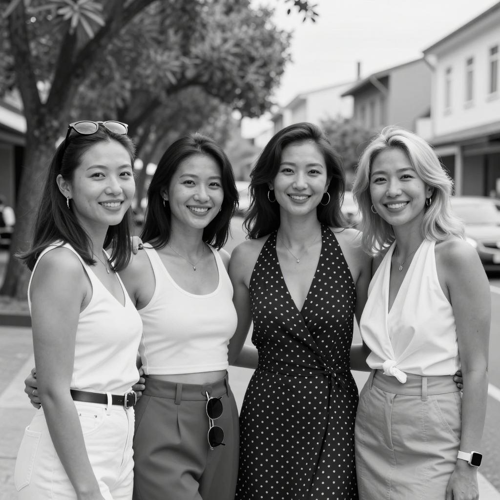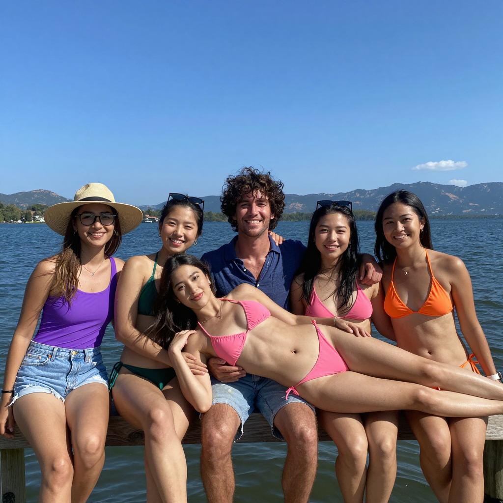 Photograph of six people at a lake. Central man with curly hair, blue shirt, surrounded by four women in bikinis and one woman in a purple top and shorts. All smiling, sitting on wooden beam. Background: lake, mountains, dock. Woman in purple top wears glasses and straw hat. Woman in green bikini hugs central man's waist. Woman in pink bikini leans on him, legs stretched out. Woman in orange bikini sits to right, arms around central man's shoulders. Clear blue sky, calm water.