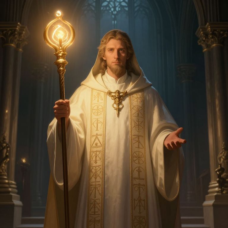 Priest character art, a solemn cleric wearing flowing robes embroidered with ancient symbols, holding a glowing staff, standing in a dimly lit gothic cathedral, mystical aura, detailed facial features, dramatic lighting, intricate background, fantasy style illustration