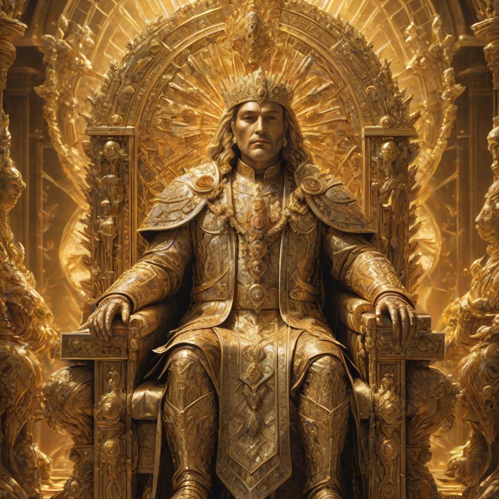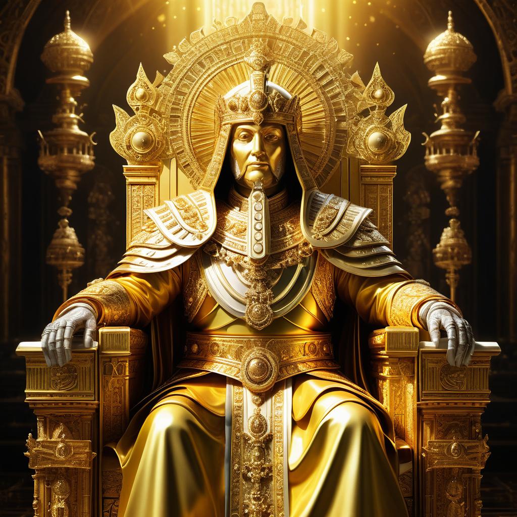 Majestic illustration of the Emperor of Mankind, depicted in ornate golden divine regalia, seated on the Golden Throne, bathed in radiant divine light.