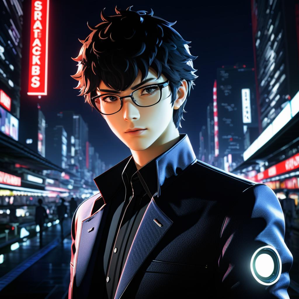 Close-up digital portrait of a young male character inspired by Persona 5, featuring curly dark hair, glasses, and a high-collared jacket. The background depicts a vibrant urban nightscape with illuminated signs and blurred crowds, emphasizing a cinematic and stylish flair.