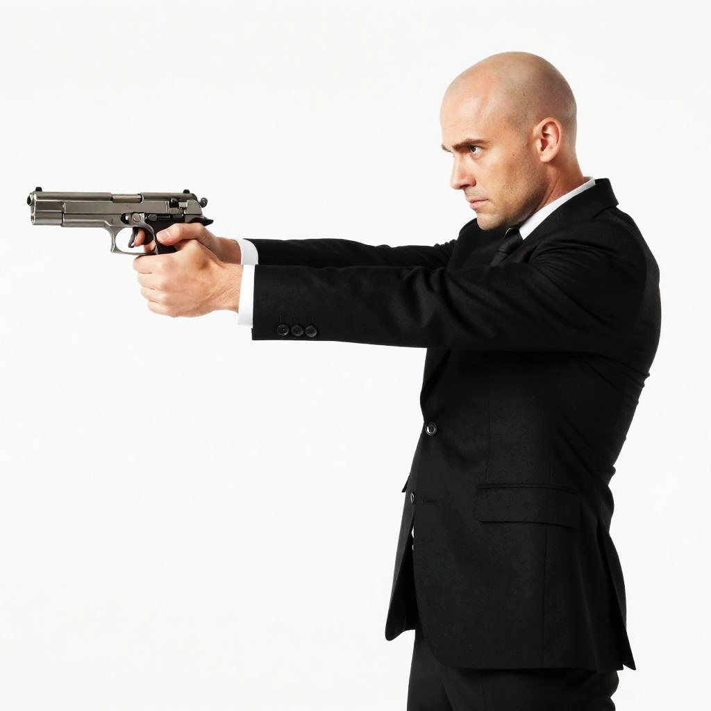 Bald man in black suit, intense expression, aiming two silver handguns, one in each hand, white ured background, left arm extended.