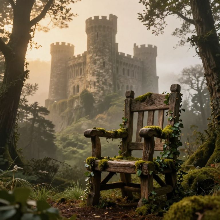 Castleandchair nestled together in a misty enchanted forest, ancient stone castle towering behind a rustic wooden chair adorned with ivy and moss, soft golden light filtering through fog, magical and serene atmosphere, detailed medieval fantasy style.