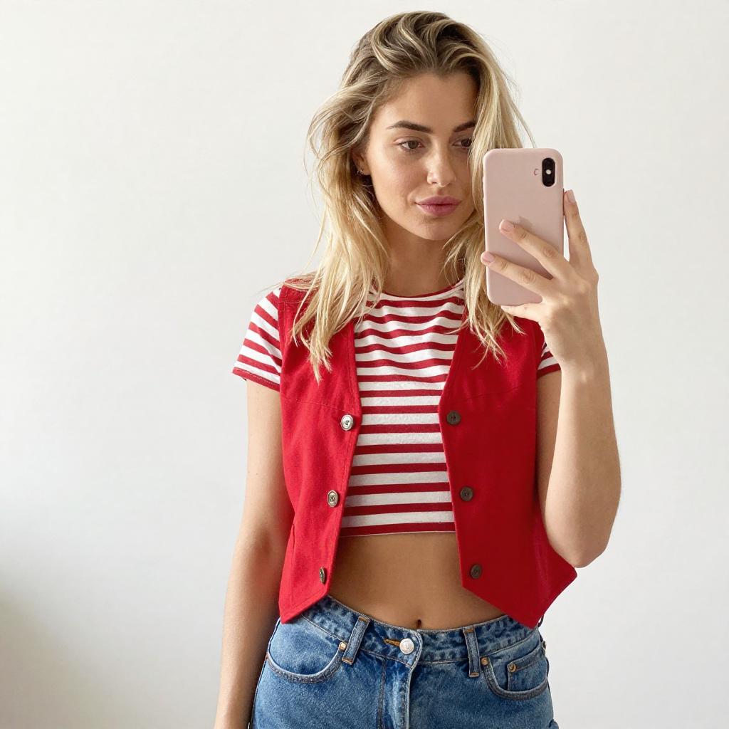 Photograph of a blonde woman with light skin taking a mirror selfie. She wears a red vest over a red and white striped shirt, exposing her midriff, and blue jeans. Her hair is slightly messy, and she holds a pink smartphone in her right hand. The background is bright and white.