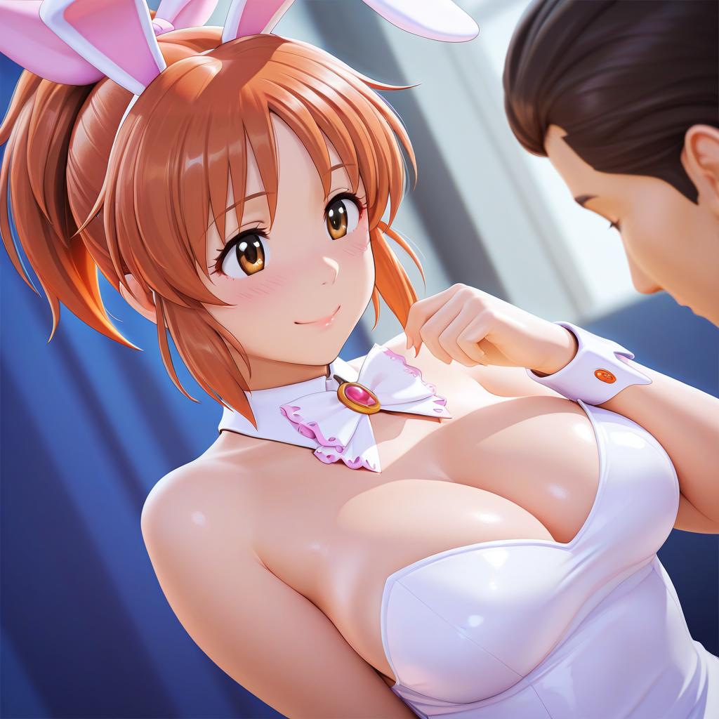 Abe nana, idolmaster, 1girl, rabbit ears, brown eyes, brown hair, orange hair, short hair, ponytail, hair ribbon, medium breasts, large breasts, by artist fugtrup, illustrious
