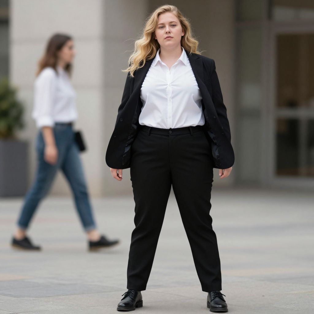 Business casual plus size, solo, blonde hair, jacket, pants, long hair, shirt, black pants, white shirt, black jacket, full body, 1boy, open jacket, looking at viewer, black footwear, male focus, open clothes, blurry background, standing, 1girl, blurry