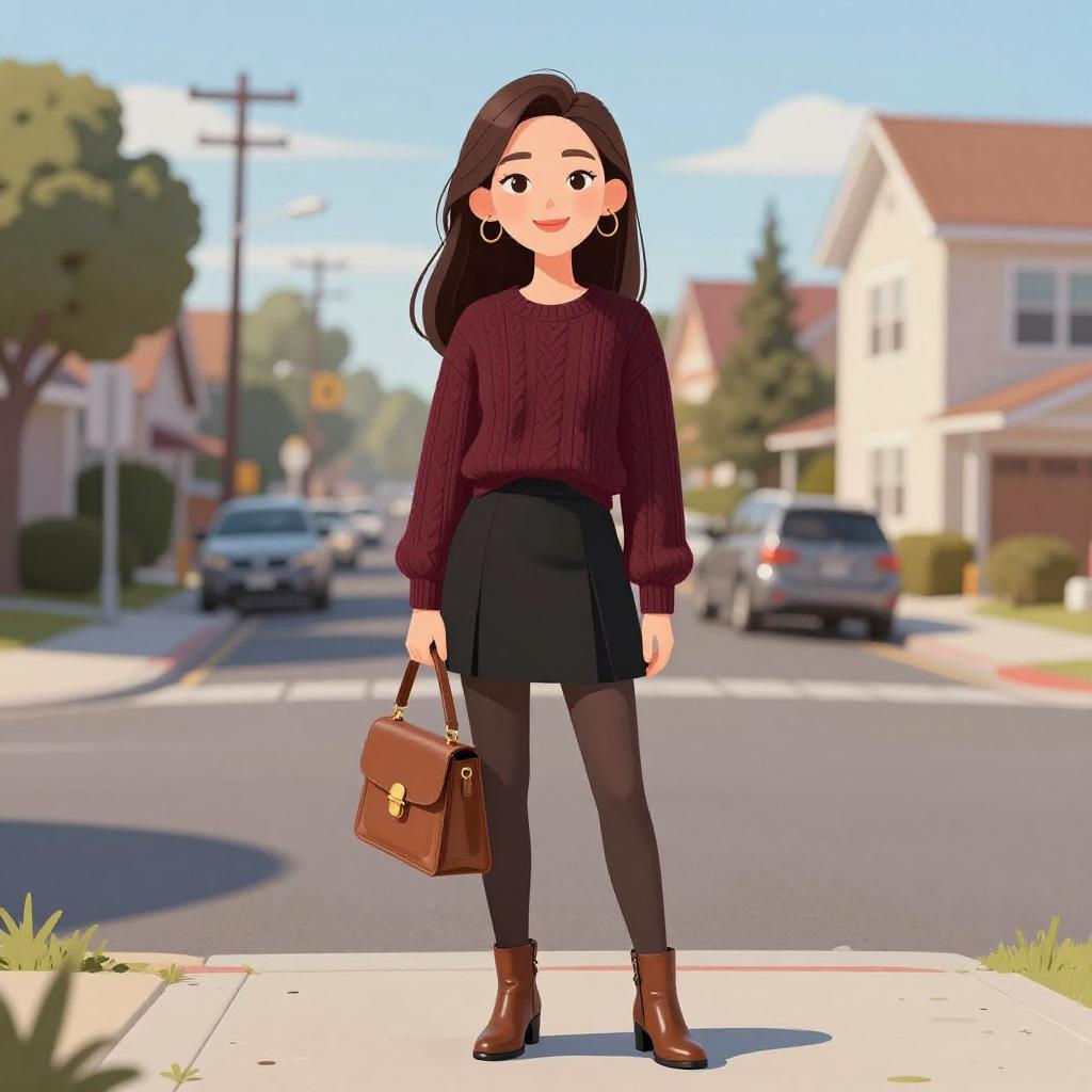 A digital cartoon image of a young woman standing on a suburban street. She has long black hair, wears large hoop earrings, a maroon ribbed sweater, black skirt, black tights, and brown ankle boots. She holds a brown leather handbag with gold hardware in her right hand. The background shows a sunny day with clear blue skies, trees, and houses on either side of the street. Cars are parked along the road, and there are power lines visible. The woman stands on a concrete sidewalk, smiling with a friendly expression. The style is reminiscent of modern, colorful digital illustrations.